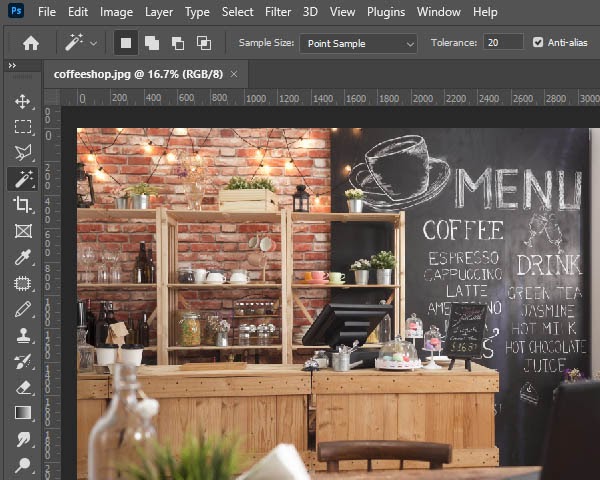 Let’s say we have a large photo of a coffee shop that we want to put on our website. Here’s what it looks like loaded in Photoshop: